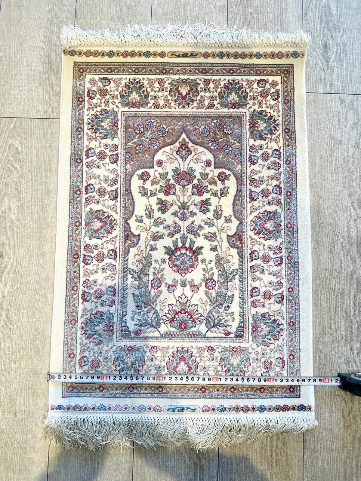 伝統的なヘレケ絨毯風花柄デザインのラグ、クリーム色と赤のアクセントが特徴のハイブリッドシルク玄関マット、フリンジ付きでエレガントな印象。