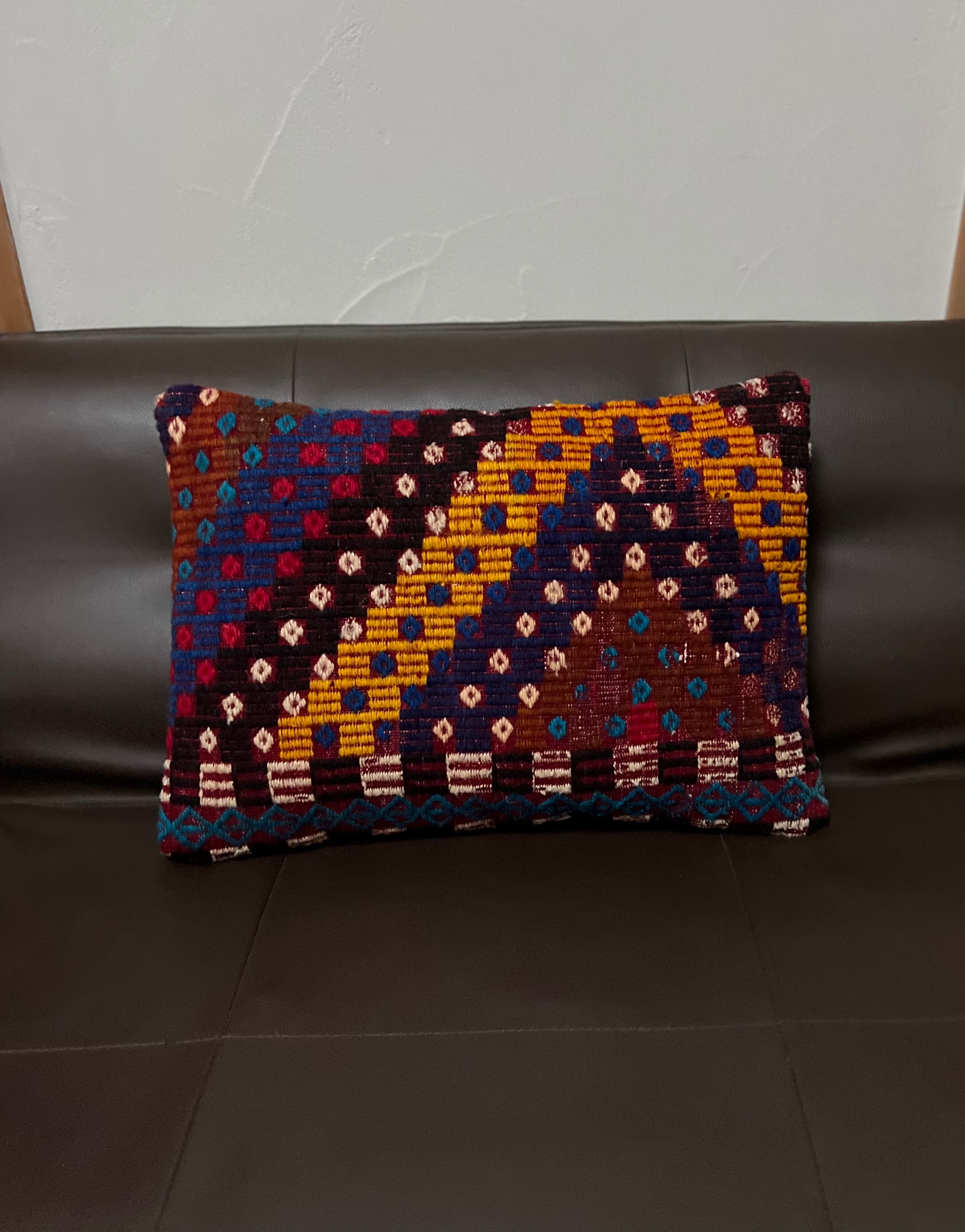 このクッションカバーは、刺繍が織り込まれたジジムがデザインの特徴となっているヴィンテージキリムで作られています。